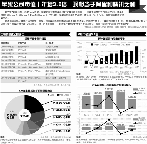 蘋果公司2017年第三財季數(shù)據(jù)顯示,蘋果第三季度營收為454.08億美元,比去年同期的423.58億美元增長7%;凈利潤為87.17億美元,比去年同期的77.96億美元增長12%。然而大中華區(qū)的業(yè)績?nèi)栽谙碌_@一區(qū)域第三季度營收為80.04億美元,比上一財季下滑25%。這已經(jīng)是蘋果在大中華區(qū)遭遇的六連跌,相較兩年前168億美元的營收,跌幅已經(jīng)過半。