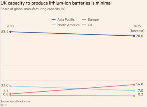 研究和咨詢公司W(wǎng)ood Mackenzie表示,在全球鋰離子電池制造領(lǐng)域英國(guó)所占份額不到1%。