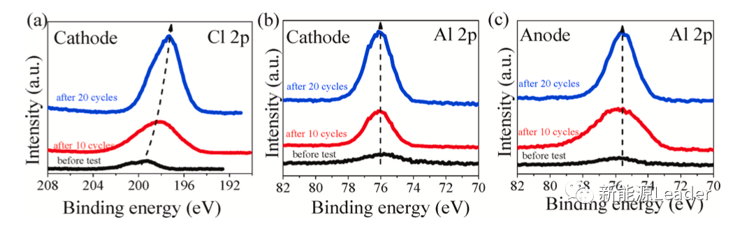 為了進(jìn)一步分析該電池的反應(yīng)機(jī)理,作者采用XPS工具對(duì)經(jīng)過(guò)不同循環(huán)的正負(fù)極進(jìn)行了分析,從下圖a可以看到隨著循環(huán)次數(shù)的增加Cl 2p逐漸向低結(jié)合能的方向偏移,并且強(qiáng)度明顯增加,這主要是部分氯鋁酸陰離子在嵌入到石墨材料中后無(wú)法脫出,在石墨中積累造成的造成的,這也是為什么雙離子電池的庫(kù)倫效率較低。從下圖b中我們注意到Al 2p的結(jié)合能沒(méi)有出現(xiàn)偏移,但是隨著循環(huán)次數(shù)的增加,強(qiáng)度出現(xiàn)了明顯的增加。從下圖c中我們也能能夠同樣觀察到負(fù)極中Al的含量出現(xiàn)了顯著的增加。