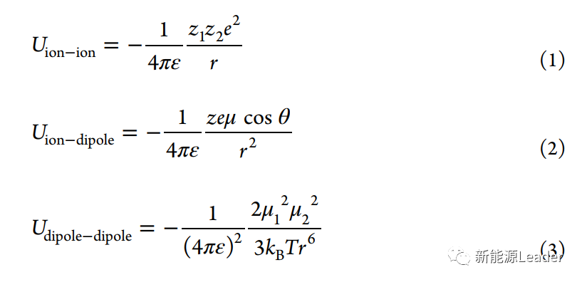 分子間的作用力主要包括離子-離子、離子-偶極子和偶極子-偶極子三種形式,在經典物理模型中,這三種力的電勢如下所示。其中ε為介電常數,ze為離子的電荷數,μ為偶極子的偶極矩,r為離子間距或偶極子的中心距,θ為偶極矩傾角,kB為Boltzmann常數,T為絕對溫度。