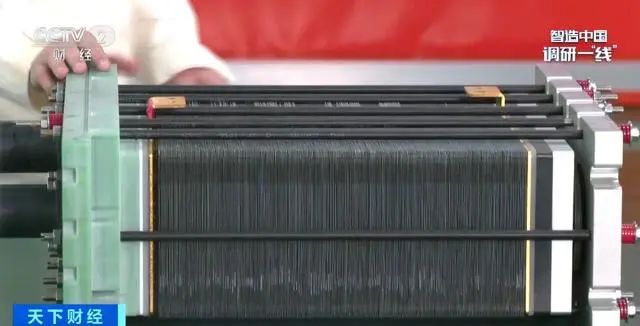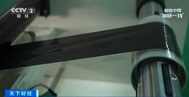 一條產線正在進行膜電極的生產,制作過程就是將催化劑均勻涂在質子交換膜的兩側。這條產線的催化劑只有3微米厚,相當于正常頭發絲的二十分之一。它可以使生產的膜電極更薄、重量更輕,從而降低整個電堆的厚度,提高功率。目前,這條產線可以實現每天生產1萬片膜電極。