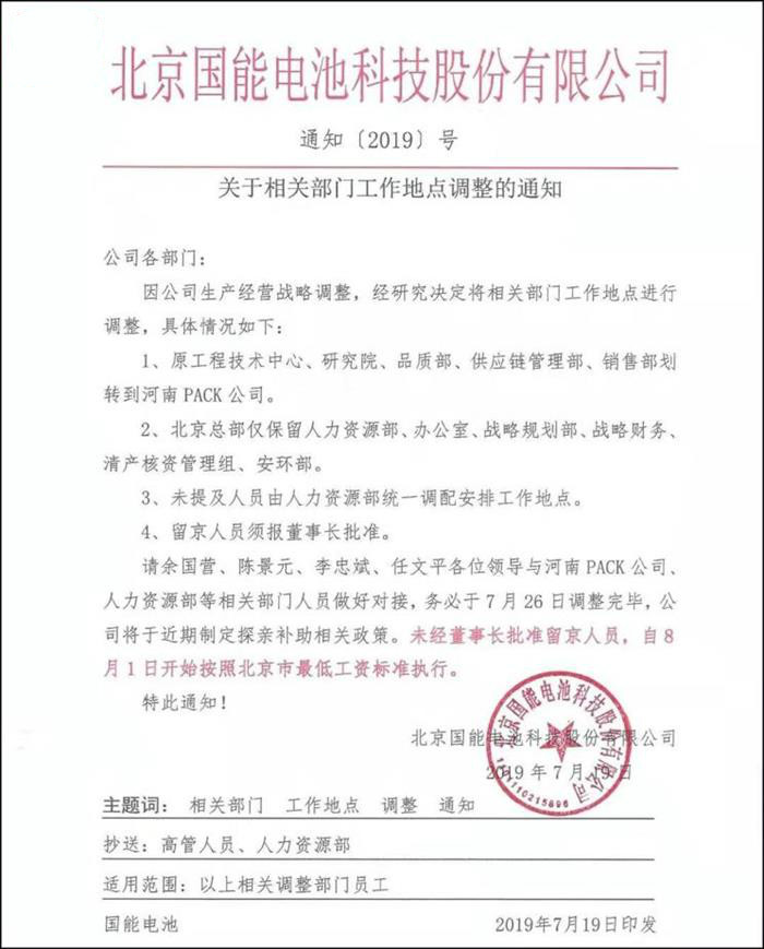 北京工廠停產(chǎn)后,國(guó)能電池將生產(chǎn)基地向河南鄭州轉(zhuǎn)移,北京僅保留總部職能。同時(shí),國(guó)能電池要求北京員工也遷往河南,留守員工必須經(jīng)過董事長(zhǎng)批準(zhǔn),否則自8月起按照最低工資標(biāo)準(zhǔn)執(zhí)行。這一規(guī)定在員工眼里則是“變相裁員”。