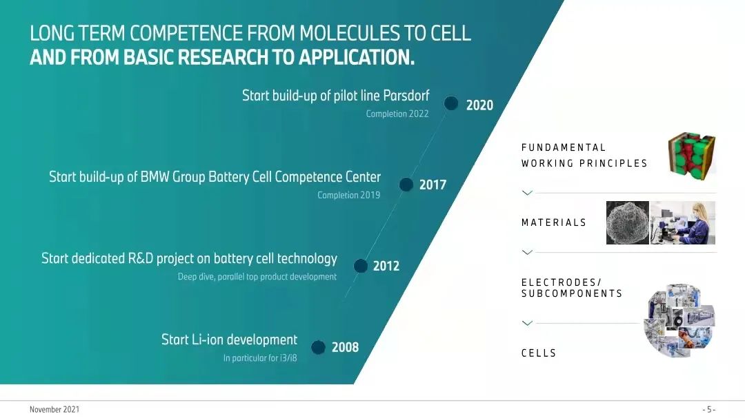 2008年,寶馬開始為i3和i8等研究鋰電池;2012年開始專項電芯技術的研發項目;2017年開始建立寶馬電芯能力中心,于2019年完成;2020年開始在慕尼黑附近的Parsdorf基地建立試產生產線,定于2022年完成。