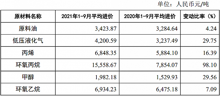 不過,石大勝華所需的原材料價格也漲勢顯著。據其披露,2021年前9月,環氧丙烷的平均進價從2020年同期的7854.07元/噸增至15558.67元/噸,同比增幅98.1%;低壓液化氣的平均進價也從上年同期的3237.49元/噸增至4200.59元/噸,同比增幅29.75%;甲醇的平均進價也從上年同期的1529.93元/噸升至1982.18元/噸,同比增幅29.56%。