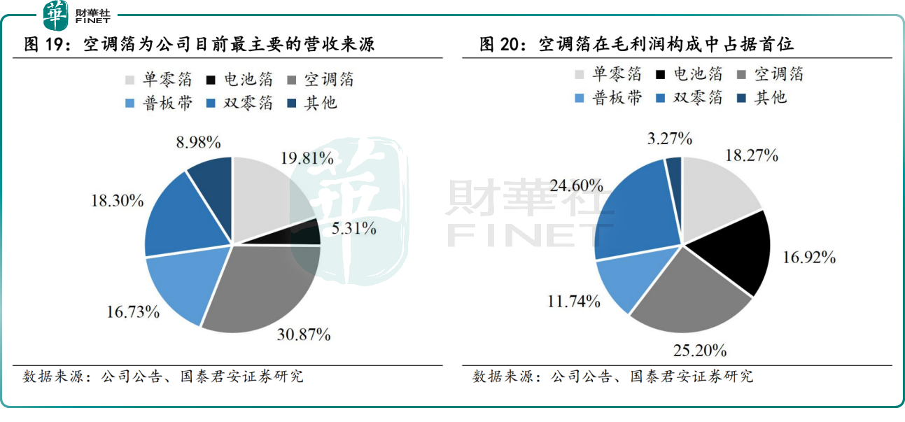 分產品來看,空調箔、單零箔以及雙零箔是公司營收的主要來源。國泰君安證券研報顯示,2021年前三季度,空調箔、單零箔以及雙零箔收入分別占據30.87%、19.81%、18.3%。毛利潤方面,結構與收入相似,空調箔、雙零箔、單零箔為毛利潤的主要構成,分別占據25.20%、24.60%、18.27%。
