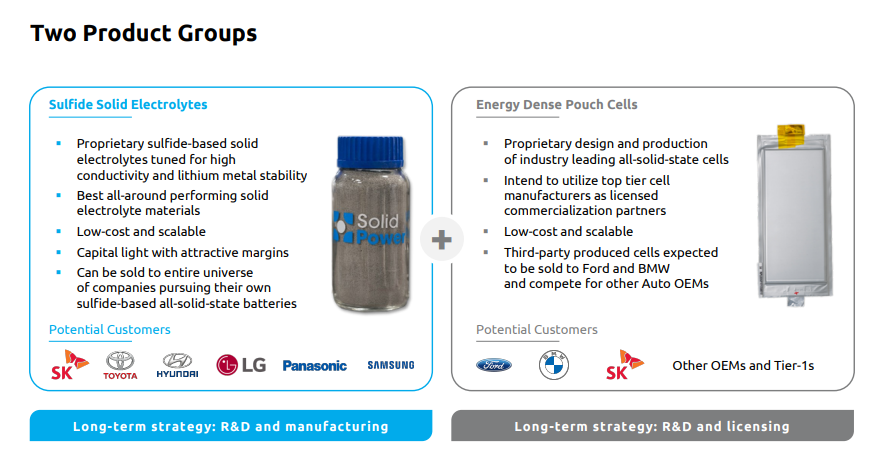 Solid Power主要有兩條產品線:硫化物固體電解質和軟包固態電池。前者潛在客戶包含SKI、豐田、現代、LG、松下、三星,后者擁有福特、寶馬、SKI及其他OEM和Tier 1等潛在客戶。