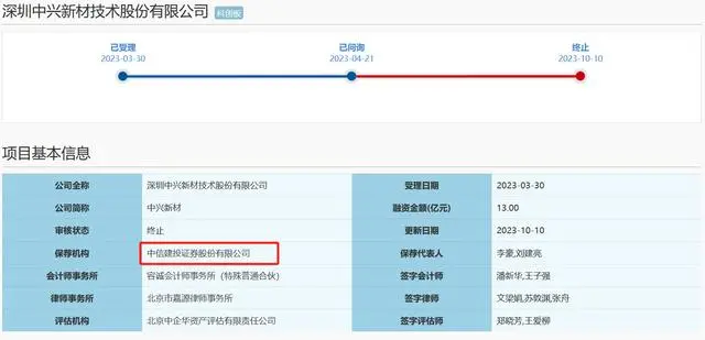 日前,上交所網(wǎng)站顯示,中興新材因保薦人中信建投證券撤銷保薦,根據(jù)有關(guān)規(guī)定,上交所終止其發(fā)行上市審核。