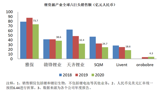 據(jù)相關(guān)上市公司披露數(shù)據(jù),全球前六大鋰資源公司分別為雅保、贛鋒鋰業(yè)、天齊鋰業(yè)、SQM、Livent和orobore。這六家公司2020年度分別在鋰礦及鋰衍生物領(lǐng)域銷售額達(dá)到73.7億元、38.6億元、32.4億元、24.7億元、18.6億元和4.3億元(人民幣,人民幣兌美元匯率以6.44進(jìn)行折算)。
