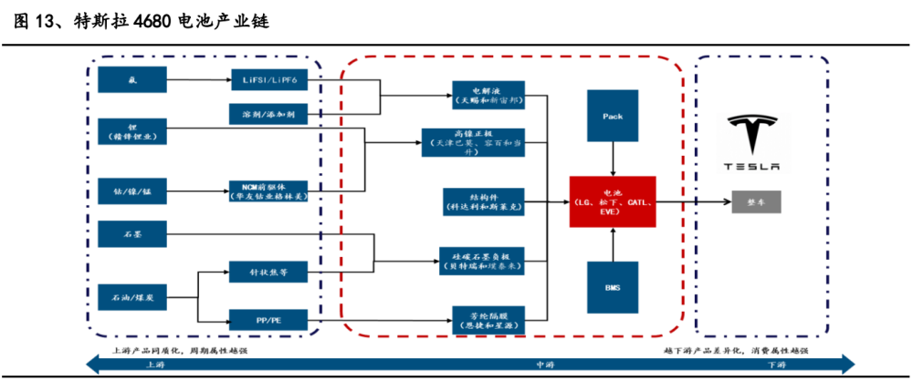 動力電池逐步形成了專業化程度高、分工明確、各司其職的產業鏈體系,主要分 為上、中和下游。上游包括鈷、錳、鎳礦、鋰礦以及石墨礦,其中鈷、錳、鎳礦 一般作為正極材料上游,鋰礦應用最為廣泛,石墨一般只作為負極材料。中游產 業鏈由正極、負極、電解液、隔膜、銅箔等組成。下游產品則是由單體電池、模 組、線束、連接器以及 BMS 管理系統整體組成的動力電池系統。上游產品同質化 程度高,周期屬性較強,下游產品的差異化較大,消費屬性強。4680 電池技術革 新和大規模應用,對電池產業鏈影響較大。