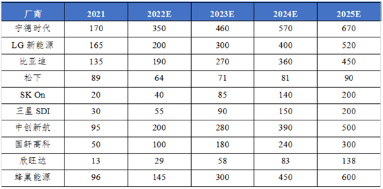 為發掘巨大的市場潛力,全球動力電池廠商加碼布局,動力電池企業對于產能的擴張近乎饑渴。據不完全統計,國內主流廠商至2025年產能有望超過1TWh,其中CATL規劃產能超670GWh,比亞迪所規劃的產能約450GWh,蜂巢能源產能規劃表現激進,兩年時間,產能規劃翻五倍,從計劃2025年規劃120GWh的動力電池產能到規劃600GWh產能,產能規劃僅次于寧德時代。