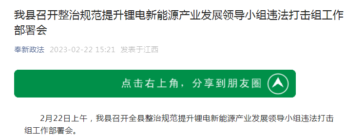 2月22日,宜春下轄的奉新縣召開全縣整治規范提升鋰電新能源產業發展領導小組違法打擊組工作部署會。