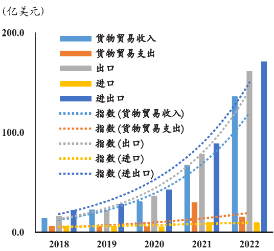 圖1 新能源電池企業進出口及貨物貿易收支情況從貨物貿易收支情況看,新能源電池企業貨物收支額與進出口額同步增長,2022年貨物貿易收支總額151.8億美元,同比增長55.6%(圖1)。