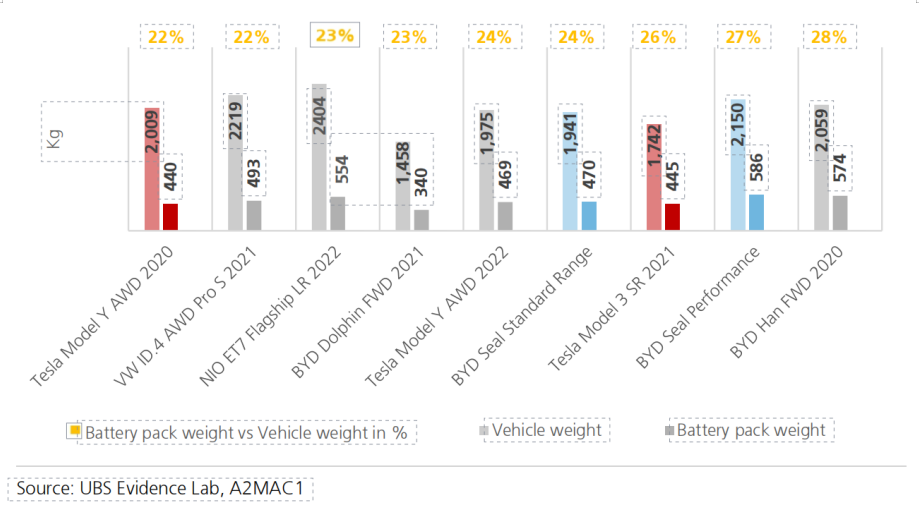 這是因為磷酸鐵鋰CTP能量密度稍遜于三元鋰CTP,想要做到更高續(xù)航,必須堆更多更重的電池。比如,瑞銀投資銀行研究部對比了幾款BEV的電池包占整車重量比,發(fā)現(xiàn)海豹(550km續(xù)航版本)電池包占整車重量比例在24%-27%之間,對比2022款Model Y及ID.4等車型,重量比相對高一點。