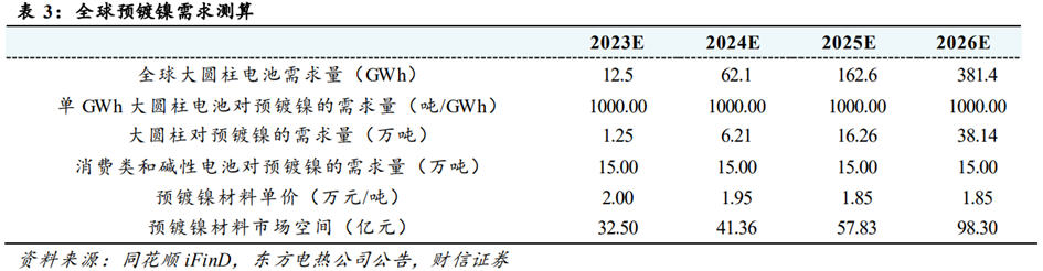 預計2026年預鍍鎳材料需求超53萬噸,市場空間98億元。預計2025年全球大圓柱電池的需求量為381.4GWh,對應的實際預鍍鎳需求約為38萬噸。加上消費類和堿性電池需求差不多在15萬噸,總需求約在53萬噸左右。若以1.85萬元/噸的單價進行計算,則2026年市場空間超98億元。