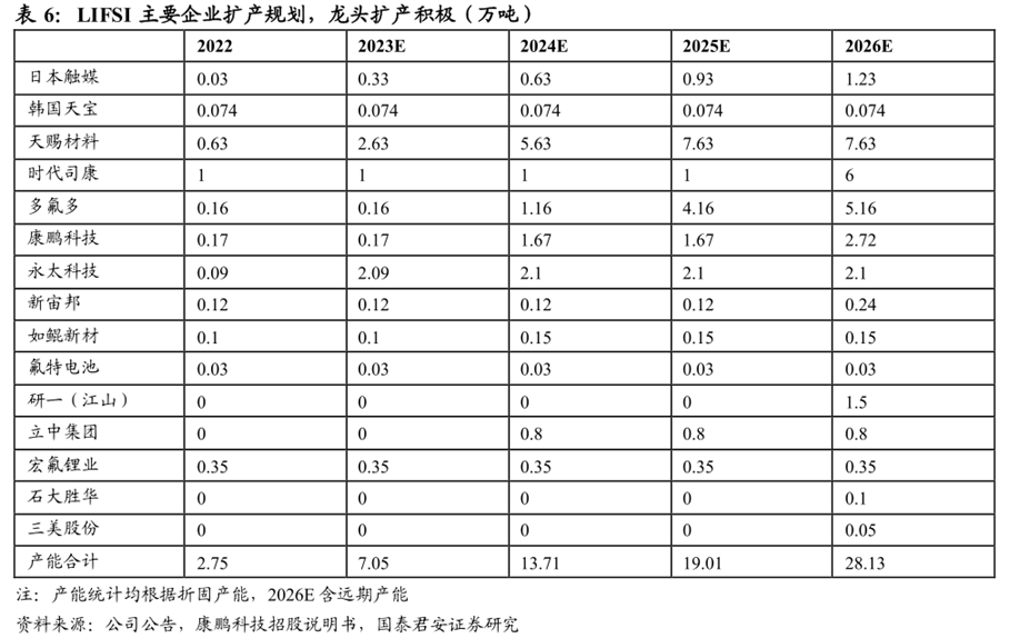 企業積極擴產LIFSI,成本和性能將決定開工率。LIFSI最開始由日本觸媒于2013年開始量產,且受工藝壁壘高、提純過程復雜等影響,該產品呈現壟斷特點。隨著2017年前后國內企業陸續開展中試,如天賜材料、康鵬科技、新宙邦等公司相繼突破技術瓶頸,逐步打破日韓企業壟斷格局。國內廠商積極擴產,2023年底總產能預計超過7萬噸,其中國內產能超過94%。到2025年,LIFSI產能預計突破19萬噸。LIFSI擴產節奏積極,但多數產線仍處于調試階段,開工率取決于產品質量,最終取決于產品成本,中長期具備規模效應且成本控制能力強企業將脫穎而出。