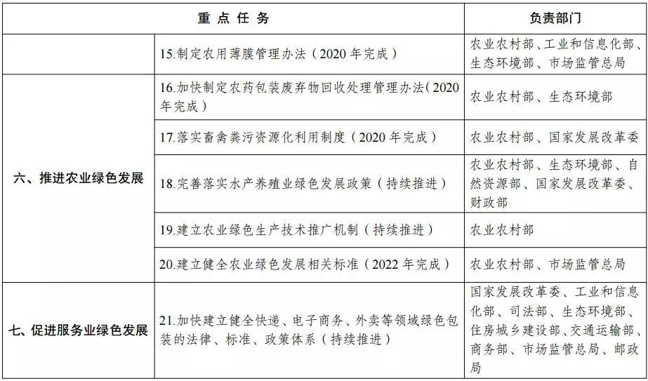 (九)促進服務業綠色發展。在市政公用工程設施和城鄉公共生活服務設施的規劃、建設、運營、管理有關標準和規范制修訂中,全面貫徹綠色發展理念,提升綠色化水平。完善綠色物流建設支持政策。加快建立健全快遞、電子商務、外賣等領域綠色包裝的法律、標準、政策體系,減少過度包裝和一次性用品使用,鼓勵使用可降解、可循環利用的包裝材料、物流器具。健全再生資源分類回收利用等環節管理和技術規范。(住房城鄉建設部、自然資源部、國家 發展改革委、工業和信息化部、司法部、生態環境部、交通運輸部、商務部、市場監管總局、鐵路局、民航局、郵政局等按職責分工負責)