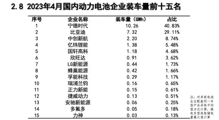 排名2023年4月國內動力電池企業裝車量前十五名的企業分別為寧德時代、比亞迪、中創新航、億緯鋰能、國軒高科、欣旺達、LG新能源、蜂巢能源、孚能科技、瑞浦蘭鈞、正力新能、捷威動力、安馳新能源、多氟多和力神。其中,寧德時代、比亞迪、中創新航依然保持著前3的位置,和3月相同。